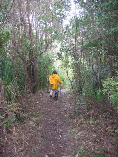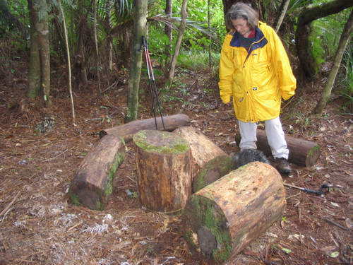 Ten minutes to Simla. Sure enough, the track eases off, and we begin to see, here and there, pine trees marking the site of the original farm. We reach the clearing, sum it up as a potential picnic spot - it's still showering intermittently - score it near zero, and head back about 50 metres to where somebody has organised some old pieces of pine trunk. Lunch is welcome and the thermos of tea is even more so. Given the effort that has gone into the Montana Heritage Trail information board and the signposts, given the spot is recommended in the handout as a halfway break point and picnic spot, a minimal shelter and a seat would have been better reward for our efforts. But given that we have reached here in a fraction of the three days the original farmer took to make the trip from Auckland, we've made at least some progress.